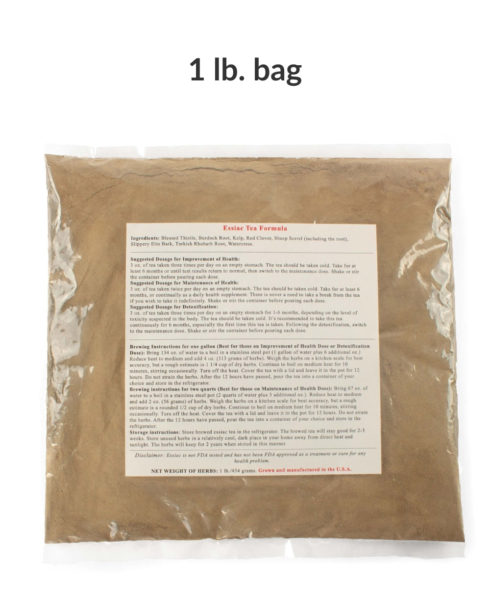 After doing some research on Essiac tea it was a no brainer to go for the 10LB bulk order. My husband and I both take it 3 times per day. I am a very health conscious advocate. I want to be pro active with all the challenges that we are faced with as we age. I have more energy than people half my age and I don’t get sick..